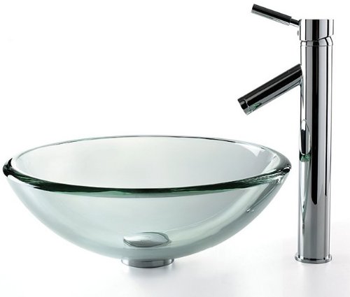 Create an elegant style to a bathroom with this clear 19mm glass sink and Kraus faucet combination. This combination sink and faucet will turn an ordinary bathroom into a modern and stylish space.../ Clear 19mm thick Glass Vessel Sink and Sheven Faucet C-GV-101-19mm-1002CH: 17" D x 5.5" H / Faucet Vessel
